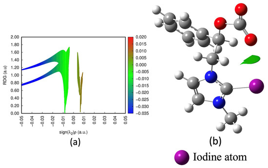 (a) The Reduced Density Gradient (RDG) scatter graph representing the NCI of I1 2I-1M-HIm shown in Figure 8b. (b) Visual representation of the NCI as a green surface.