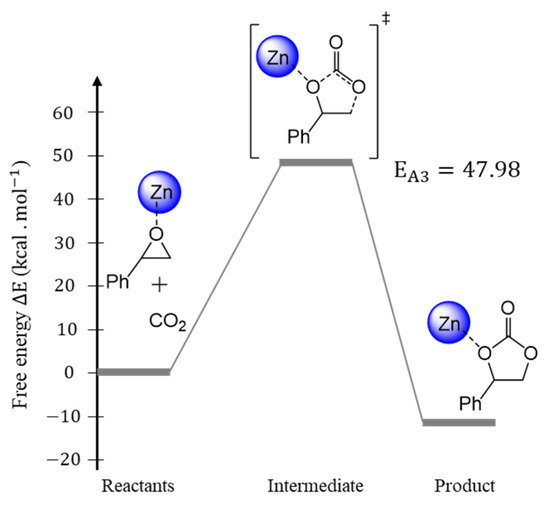 The LA catalyzed pathway follows a one-step concerted mechanism. The opening of the epoxide ring and the cycloaddition of the carbon dioxide are performed simultaneously. The free energy diagram, along with the structure of the transition state are presented in Figure 9. The activation energy (noted EA3 here) for this transformation is higher than those of the LB-catalyzed mechanism with a value of 48 kcal/mol. This high barrier gives rise to the possibility of competitive reactions and can explain the low yield of 21% obtained experimentally (Table 1).
