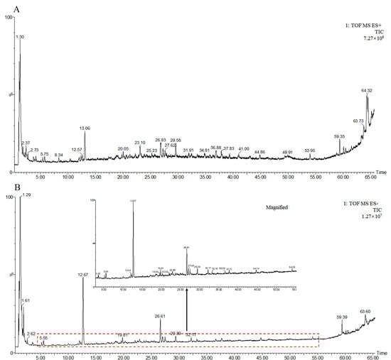 The total ion chromatograms of AS aqueous extract in positive (A) and negative (B) ion modes.