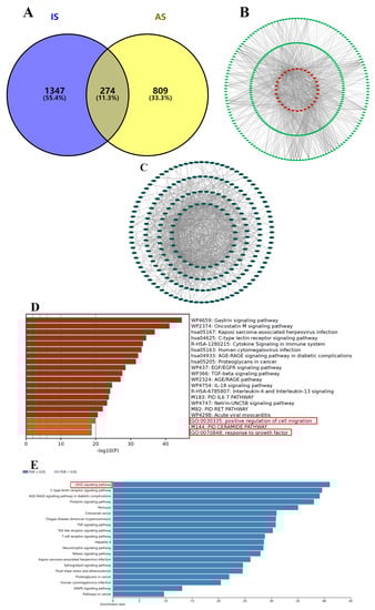 Network pharmacology analysis of AS. (A) Venn diagram of AS−related targets and IS−related targets. (B) Ingredient−target network of AS against IS. (C) The PPI network of 274 mutual targets. (D) The top 20 GO terms of core targets. (E) The top 20 KEGG pathways of core targets.