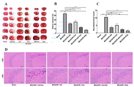 Hematoxylin-eosin (HE) staining (Figure 3D) revealed that the pyramidal cells in the sham group were arranged neatly and tightly, nuclei were large and round, nucleoli were obvious, and cell morphology was intact, which verified that the cell morphology in the sham group was normal. Nevertheless, the pyramidal cells in the MCAO/R group were loosely arranged, cell nuclei appeared severely pyknotic or even disappeared, and large vacuolar structures appeared in the perinuclear region. These damaged alterations were improved after the administration of AS, Cel, or Eda. Compared to the MCAO/R group, clearer tissue structure was observed in the CA, Cel, or Eda−treated groups, indicating that the injury induced by MCAO/R was significantly alleviated. The cell morphology and structure in the AS + Cel group were comparable to those in the sham group and better than the Cel group, which suggested that AS alleviated cerebral ischemia reperfusion injury (CIRI).