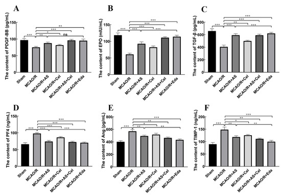 AS regulated the expression of PDGF-BB (A), EPO (B), TGF-β (C), PF4 (D), Ang-2 (E), and TIMP-1 (F) (n = 6 rats for each group). Data are expressed as the mean ± SD, * p < 0.05; ** p < 0.01; *** p < 0.001; ns stands for no statistical significance.