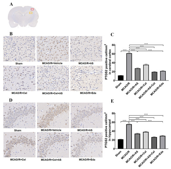 AS treatment inhibited the expression of PTGS2. (A) The observation areas in the cortex (red) and hippocampus (yellow). (B) The immunohistochemical staining (400×) of PTGS2 in the cortex and (C) quantitative analysis. (D) The immunohistochemical staining (magnification was 400×) of PTGS2 in the hippocampus and (E) quantitative analysis. (n = 3 rats for each group). Data are expressed as the mean ± SD, *** p < 0.001. ns stands for no statistical significance.