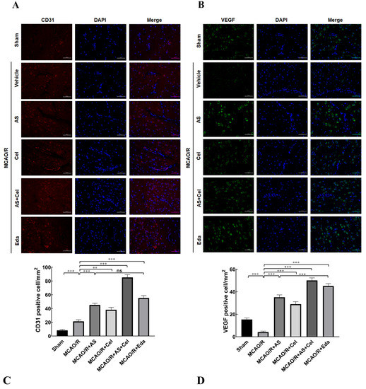 AS treatment promoted angiogenesis. (A) The immunofluorescent staining (magnification was 400×) of CD31 and (B) quantitative analysis. (C) The immunofluorescent staining (magnification was 400×) of VEGF and (D) quantitative analysis. Red fluorescence indicates CD31 signal, and green fluorescence indicates VEGF signal. (n = 3 rats for each group). Data are expressed as the mean ± SD, ** p < 0.01, *** p < 0.001; ns stands for no statistical significance.