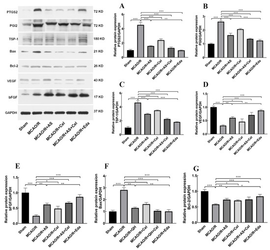 The RNA was extracted from the homogenate of the penumbra by an RNA-extracting reagent and was reverse transcribed as cDNA in term of the instructions with 5X All-In-One RT MasterMix (Applied Biological Materials, British Columbia, Canada). PCR was performed to amplify sequences of PTGS2, PGI2, TSP-1, bFGF, VEGF, Bcl-2, and Bax, according to the instructions, with EvaGreen qPCR MasterMix-ROX (Applied Biological Materials, British Columbia, Canada) using the PCR Amplifier (Lightcycler 480Ⅱ, Roche, Basel, Switzerland). The mRNA levels were calculated by relative quantification (2−ΔΔCt), and GAPDH served as an internal reference gene. Three independent experiments were performed. The primers of PTGS2, PGI2, TSP-1, bFGF, VEGF, Bcl-2, and Bax were synthesized by Sangon Biotech Co., Ltd. (Shanghai, China), and the primer sequences were shown in Table 1.