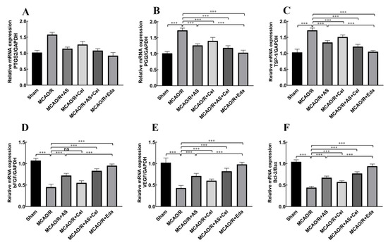 To study whether PTGS2 increased in rats with MCAO/R, immunohistochemical staining was used to quantitatively detect the expression of PTGS2. The analysis of PTGS2 in the cerebral cortex and in the penumbra is shown in Figure 5B,C. Compared with the sham group, the expression of PTGS2 was manifestly increased in the MCAO/R group, which confirmed that MCAO/R induced the abnormal increase in PTGS2. After treatment with AS, Cel, or Eda, the expression of PTGS2 was reversed, which suggested that AS reduced the expression of PTGS2. The same results are shown in Figure 5D,E. The expression of PTGS2 in hippocampal CA3 in the penumbra increased compared with the sham group, and AS, Cel, and Eda reduced it in the MCAO/R group. These results suggest an abnormal increase in PTGS2 in rats with MCAO/R, and AS reduced the expression of PTGS2 in the cerebral cortex as well as hippocampal CA3.
