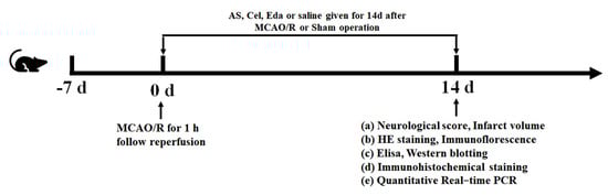 The rats were randomized into the following groups: a sham group, a MCAO/R group, a MCAO/R group with AS, a MCAO/R group with Cel, a MCAO/R group with Cel and AS, and a MCAO/R group with Eda. Cel was used as an inhibitor of PTGS2, and Eda was used as a positive drug. The rats in different drug treatment groups were treated with AS, Cel, and Eda by oral gavage once a day for 14 d, and the dosages were as follows: 3.6 g/kg, 10 mg/kg, and 10 mg/kg, respectively. The rats in the sham and MCAO/R groups were treated with the same volume of normal saline (Figure 9). The dosages of Cel and Eda were determined by reports from the literature [28,29]. The dosage of AS for rats was converted according to the human clinical dosage (40 g/70 kg).
