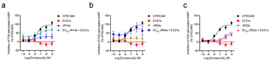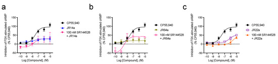 CB2R-dependent inhibition of FSK–stimulated cAMP CHO cells stably expressing hCB2R. cAMP inhibition data are expressed as the %CP55,940 response. Cells were treated with ligands simultaneously, as indicated. Addition of 100 nM SR144528 to JR14a (a), JR64a (b), or JR22a (c). Data were fitted to a nonlinear regression (three-parameter models, GraphPad v. 9.0). Data are mean ± S.E.M. 3 or more independent experiments performed in triplicate. Specific n values and data from these graphs are presented in Table 1.