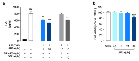 The anti-inflammatory response of analog JR22a was examined using LPS/TNFα stimulated HMC3 cells, a model of inflammation previously used by us to evaluate the anti-inflammatory properties of JR14a and JR64a derivatives [15]. Consistent with our previous findings [10,15], LPS/TNFα administration induced a significant release of pro-inflammatory interleukin 6 (IL-6) in cell media compared to control cells (Figure 5A).