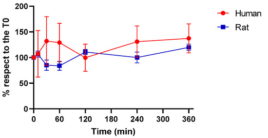 Plasma stability was evaluated at the time points 0, 10, 30, 60, 120, 240, and 360 min over two species, rodent (rat) and human, and assessed by LC-HRMS. Results are expressed as a relative percentage (mean ± SD) with respect to the amount at t = 0 min. JR22a is stable both in rat and human plasma up to the last time point tested (360 min), as can be observed in Figure 6.