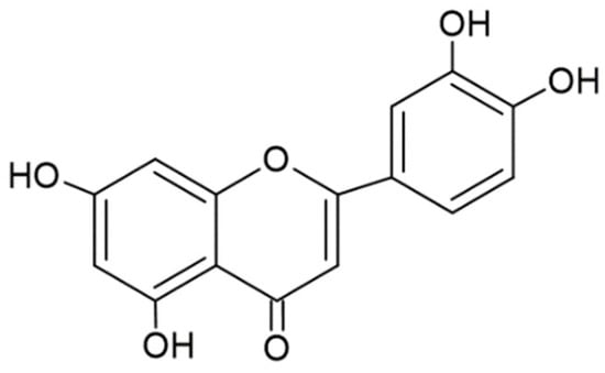One of the most common flavones is luteolin (3′, 4′, 5,7-tetrahydroxyflavone), which has a yellow crystalline appearance []. The chemical structure of luteolin is shown in Figure 1, and its molecular formula is C15H10O6. Many vegetables, medicinal herbs, and fruits are rich in luteolin, including carrots, broccoli, cabbages, parsley, thyme, peppermint, basil, celery, artichoke, and apples []. The active metabolite or derivatives of luteolin such as luteolin glucuronide and luteolin 7-glucoside have been reported to have anti-oxidant, anti-tumor, anti-microbial, anti-inflammatory, anti-apoptotic, anti-allergy, anti-diabetic, chemotherapeutic, cardioprotective, and neuroprotective properties []. Most studies of luteolin have focused on its anti-inflammatory effects.