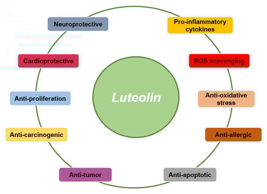 Many diseases cause inflammation in the body’s tissues and organs. Like other flavonoids, luteolin exhibits a variety of pleiotropic properties, making it difficult to attribute all of its pharmacological effects to a single metabolic process. Luteolin has anti-inflammatory properties at micromolar concentrations, including the restraint of proinflammatory mediators (e.g., COX-2, nitric oxide (NO), IL-6, IL-1, and TNF-α) and the regulation of several signaling pathways, including the nuclear factor (NF)-κB, activator protein (AP)-1, and JAK–STAT pathways. Crosstalk connects all those pathways, and luteolin can control and repress them. The most important effect of luteolin, however, is its potent antioxidative power, which includes excellent radical scavenging and cytoprotective properties [,,].