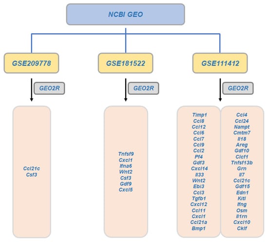 Bioinformatics analysis was performed as previously described []. The anti-inflammation-related cytokines/chemokines were identified from differentially expressed genes (DEGs) by analyzing the available transcriptomic RNA-seq data of luteolin (GSE209778, GSE181522, and GSE111412) from the Gene Expression Omnibus (GEO; https://www.ncbi.nlm.nih.gov/geo, accessed on 10 December 2022) database, accessed on 10 December 2021, as shown in Figure 3. The “limma” in R (version 4.2.2, https://www.r-project.org/, accessed on 10 December 2022) was applied to access the profile of DEGs, which had to fit the screening criteria of adjusted p-value < 0.05 and |log2 (foldchange)| > 1.