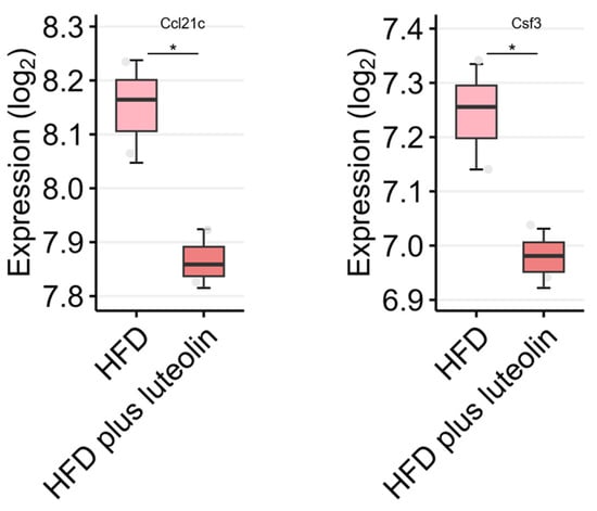 Comparison of Ccl21c and Csf3 expression in mouse muscle treated with HFD and with HFD plus luteolin. The gene expression of each cytokine/chemokine was analyzed using the GSE209778 dataset. *: p < 0.05 compared to the induction group.
