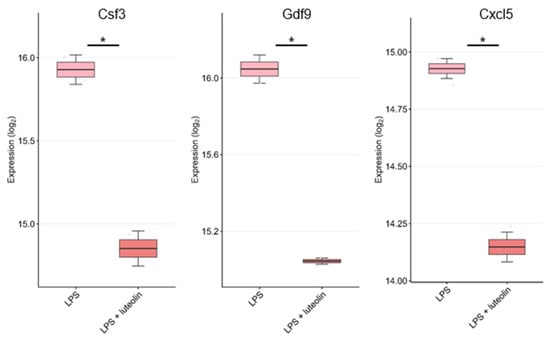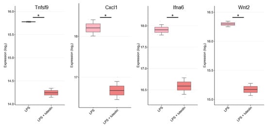 Next, we analyzed the gene expression of thirty cytokines/chemokines reported to be associated with anti-inflammatory effects by luteolin in lipopolysaccharide (LPS) and LPS and luteolin groups (Supplementary Figure S2). Figure 5 only includes the results of cytokines/chemokines that showed significant expressional changes. The gene expression of Tnfsf9, Cxcl1, Ifna6, Wnt2, Csf3, Gdf9, and Cxcl5 was significantly decreased in the LPS and luteolin group compared with the LPS group, providing strong evidence that luteolin can exhibit anti-inflammatory activity.