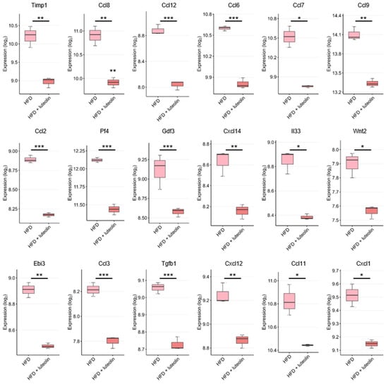 Comparison of Timp1, Ccl8, Ccl12, Ccl6, Ccl7, Ccl9, Ccl2, Pf4, Gdf3, Cxcl14, Il33, Wnt2, Ebi3, Ccl3, Tgfb1, Cxcl12, Ccl11, Cxcl1, Ccl21a, Bmp1, Ccl4, Ccl24, Nampt, Cmtm7, Il18, Areg, Gdf10, Clcf1, Tnfsf13b, Grn, Il7, Ccl21c, Gdf15, Edn1, Kitl, Ifng, Osm, Il1rn, Cxcl10, and Cklf expression in mouse epididymal adipose tissue treated with HFD and with HFD and luteolin. The gene expression of each cytokine/chemokine was analyzed using the GSE111412 dataset. ***: p < 0.001, **: p < 0.01, and *: p < 0.05 compared to the induction group.