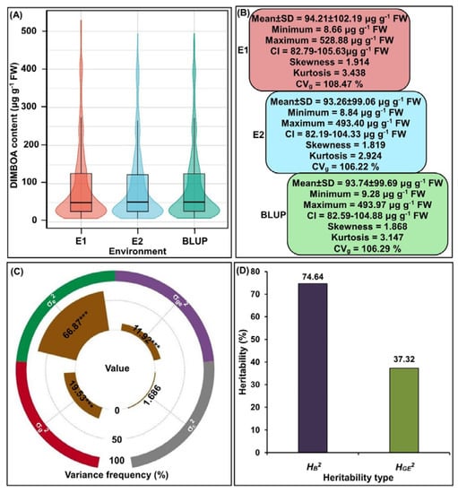 Statistical analysis of DIMBOA content at V6 stage in Zhangye (E1) and Longxi (E2) ecological environments among 310 maize inbred lines seedlings in Gansu Province, China in 2020 and their best linear unbiased prediction (BLUP) values. (A) Violin plot shows the DIMBOA content in E1 and E2 environments, and their BLUP values among all inbred lines. (B) The statistics including mean ± standard deviation (SD), minimum, maximum, confidence interval (CI), skewness, kurtosis, and genetic variation coefficient (CVg) of DIMBOA content and their BLUP values among all inbred lines in E1 and E2 environments. (C) Frequency of the genotypic variance (σg2), environmental variance (σe2), genotype × environment interaction variance (σge2), and error variance (σε2) for DIMBOA content; *** indicated a significant difference with p < 0.01 (ANOVA). (D) The broad-sense heritability () and genotype × environment interaction heritability () of DIMBOA content.