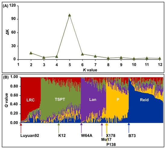 In addition, the population structure of these inbred lines was analyzed by STRUCTURE software. When various groups (K value) ranging from 1 to 12 were compared, the ΔK reached the maximum value when K = 5, thus the 310 maize inbred lines were divided into five optimal groups (Figure 2A). The inbred lines with a membership probability of ≥ 0.500 were assigned to the same groups, and if the inbred lines had a membership probability of less than this value, they were assigned to a mixed group (not assigned to any of the five groups) [,]. Of the 310 inbred lines, 294 (accounting for 94.84%) were assigned to either one of the five groups, including the Lüda red cob (LRC; 44 lines) group, Tang si ping tou (TSPT; 81 lines) group, Lancaster (Lan; 52 lines) group, P (47 lines) group, and Reid (70 lines) group, respectively, and the remaining 16 inbred lines (accounting for 5.16%) were categorized as a mixed group (Figure 2B and Figure 3A; Table S2).