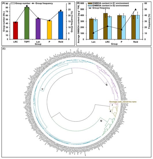 Evaluation of multiple insect-resistance among 310 maize inbred lines in both Zhangye (E1) and Longxi (E2) ecological environments by unweighted pair-group method with arithmetic means (UPGMA) cluster analysis, and their attributive group dissection. (A) Statistics for group number and frequency of each optimal group. (B) Attributive groups and their frequency distribution of three high insect-resistant and 15 moderate insect-resistant inbred lines; average of DIMBOA content for each attributive group (including Lüda red cob (LRC), Lancaster (Lan), P, and Reid group, respectively) in E1 and E2, respectively. (C) Evaluation of multiple insect-resistance among 310 inbred lines in two environments were performed using R package (http://www.R-project.org/; accessed on 20 April 2022) with UPGMA (the K value sets to 5), including type I (high insect-resistant lines), type II (moderate insect-resistant lines), type III (insect-resistant lines), type IV (moderate insect-susceptible lines), and type V (insect-susceptible lines), respectively.