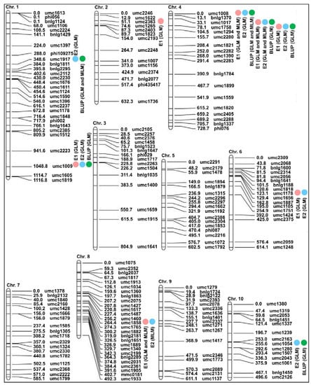 Genetic linkage map construction according to the genetic distance (centimorgan, cM) of 186 polymorphic SSRs on IBM2 2008 Neighbors map frame. The identified SSRs were significantly (p < 0.01) associated with DIMBOA content in Zhangye (E1; pink circle) and Longxi (E2; blue circle) ecological environments, Gansu Province, China in 2020. The best linear unbiased prediction (BLUP; green circle) values for these SSRs were assessed using a general linear model (GLM) and mixed linear model (MLM), respectively.