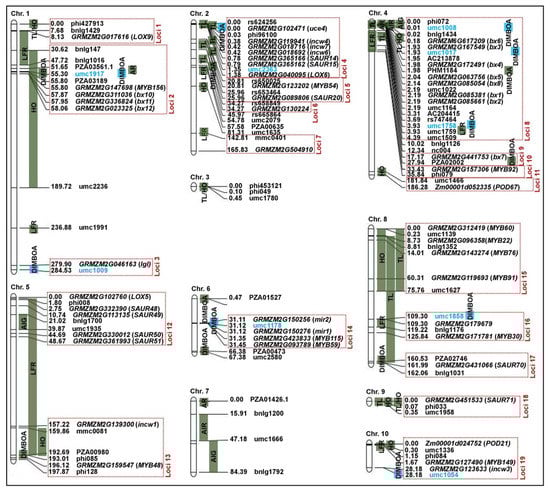 Interestingly, we identified 19 hot loci (Loci 1-Loci 19) involved in maize multiple insect resistance in the present study (Figure 5; Table 3). Of these, Loci 2 in Bin 1.04 (bnlg147-umc1917 interval) is involved in LFR, HO, AR, and DIMBOA content; Loci 4 in Bin 2.00–2.01 (rs624256-umc2363 interval) controls TL and DIMBOA content; Loci 5 in Bin 2.03–2.04 (rs650025-rs65 interval) is responsible for TL and LFR; Loci 8 in Bin 4.00–4.03 (phi072-umc1509 interval) is related to TL, LFR, AR, AIR, AIG, TL/HO, and DIMBOA content; Loci 12 in Bin 5.03 (phi008-umc1935 interval) is associated with AIG and LFR; Loci 13 in Bin 5.05–5.07 (mmc0081-phi128 interval) is associated with LFR, HO, and DIMBOA content; Loci 15 in Bin 8.01–8.03 (umc1139-umc1627 interval) regulates HO and TL; Loci 16 in Bin 8.04–8.05 (umc1858-bnlg1176 interval) is responsible for TL, LFR, and DIMBOA content; Loci 17 in Bin 8.06 (PZA02746-bnlg1031 interval) is related to TL and DIMBOA content; Loci 18 in Bin 9.01 (phi033-umc1958 interval) is involved in TL, HO, and TL/HO; and Loci 19 in Bin 10.04 (umc1336-umc1054 interval) is associated with LFR, HO, and DIMBOA content. Thus, these 11 hot loci have a pleiotropic effect on 2 to 7 multiple insect-resistant traits, and Bin 1.04, Bin 2.00–2.01, Bin 4.00–4.03, Bin 5.05–5.07, Bin 8.04–8.05, Bin 8.06, and Bin 10.04 regions play important roles in conferring DIMBOA accumulation and other aspects of maize multiple-insect resistance to ACB and CLA. Consistent with previous findings, LFR was significantly correlated with HO (phenotypic correlation coefficient (r); r = 0.252) and TL/HO (r = 0.229) in 162 F3 maize population to ACB resistance []. Meanwhile, 3 of 19 hot loci, i.e., Loci 2, Loci 8, and Loci 12 are co-involved in multiple insect resistance to both ACE and CLA; thus, we speculate that the resistance to ACB and CLA for leaf feeding damage is partially controlled by the same mechanisms in these three hot loci. For future research, the contribution of Loci 2, Loci 8, and Loci 12, as well as their functional genes must be examined when developing elite maize varieties with multiple insect resistance to ACE and CLA.