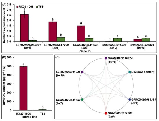 The relative expression level of five candidate genes involved in DIMBOA biosynthesis, DIMBOA content observation and their correlation in maize seedlings of RX20-1006 (high insect-resistant line) and T58 (insect-susceptible line) in Zhangye (E1) environment, Gansu Province, China. (A) The relative expression level (mean ± standard deviation) of the five candidate genes; different lowercase letters indicate a significant difference (p < 0.05) in gene expression. (B) DIMBOA content (mean ± standard deviation) in high insect-resistant (RX20-1006) and insect-susceptible line (T58); different lowercase letters indicate a significance difference (p < 0.05) in DIMBOA content. (C) The correlational relationships between the relative expression level of five candidate genes and DIMBOA content; lines represent significant correlations (p < 0.05).