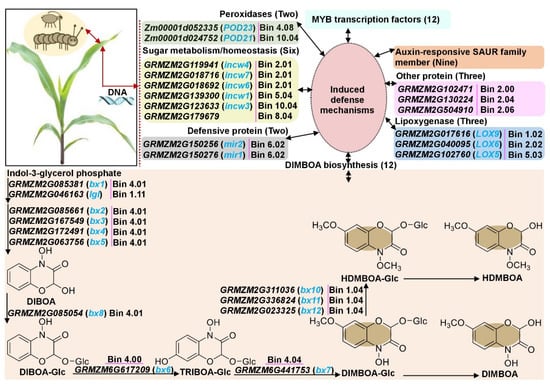 Lipoxygenase (LOX) plays critical roles in plant defense against multiple insect pests and pathogens [,,]; and, consistent with LOX’s function, we also found three LOX genes, i.e., GRMZM2G017616 (LOX9) within Loci 1 (Bin 1.01–1.02), GRMZM2G040095 (LOX6) within Loci 4 (Bin 2.00–2.01), and GRMZM2G102760 (LOX5) within Loci 12 (Bin 5.03) (Table 3). LOX6 was strongly induced by jasmonic acid and the fungal pathogen Cochliobolus carbonum in maize [].