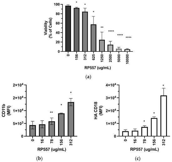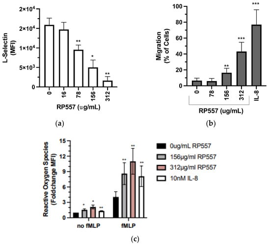 An early response of the innate immune system to a cutaneous infected wound is neutrophil degranulation that mediates changes in adhesion receptor expression and function and elicits the release of proteases and reactive oxygen species. This accompanies recruitment of neutrophils to the site of tissue insult where they release proteases and produce reactive oxygen species (ROS), as well as phagocytose bacteria, which marks the inflammatory phase of infection [20]. We first determined the dose–response effect of RP557 on human neutrophil function since they respond similarly to mouse neutrophils in response to an S. aureus infection and reagents for detecting activation as a function of conversion of β2-integrin to a high affinity state are readily available. Neutrophil viability, degranulation, activation of β2-integrins, and migratory capacity were assayed. Neutrophils remained 90% viable at an RP557 dose of 312 μg/mL, and decreased to 60% at 600 μg/mL (Figure 1a). At concentrations that maintained high viability, RP557 upregulated surface CD11b nearly three-fold and activated high-affinity CD18 that supports neutrophil migration and phagocytosis nearly six-fold (Figure 1b,c). L-selectin is maximally expressed on circulating mature neutrophils and is shed upon activation with chemotactic stimulation by proteolytic cleavage [21]. Treatment with RP557 at 78 μg/ml elicited ~40% shedding of L-selectin (CD62L), whereas 312 μg/mL elicited cleavage to undetectable levels of receptor expression (Figure 2a). Transmigration of neutrophils across porous transwell membranes was maximally stimulated by IL-8 at 10 nM and in a dose-dependent manner by RP557 (Figure 2b). Reactive oxygen species’ production was activated by RP557 alone at 156 μg/mL and increased at 312 μg/mL to a level higher than that stimulated by IL-8. Stimulation with fMLP, a potent activator of ROS production, increased levels three-fold from baseline. Co-stimulation of neutrophils with RP557 amplified ROS production in a dose-dependent manner and was more potent than IL-8 (Figure 2c). Taken together, these data indicate that RP557 functions as a chemotactic factor and pro-inflammatory agonist for neutrophils and enhances their antibacterial functions including integrin function, migration, and production of ROS.