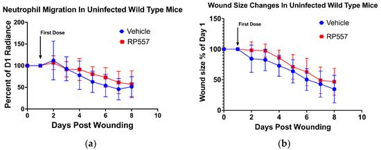 We next examined the capacity of RP557 to attract neutrophils to the site of a sterile full-thickness wound in C57BL/6 mice that stably express the EGFP-lysozyme M (lysM) gene upregulated in mature neutrophils [22,23]. Daily treatment with RP557 to uninfected nondiabetic wounds had no effect on increasing the basal level of neutrophil migration within wounds nor did it influence the rate of wound closure over time (Figure 3a,b). This indicates that RP557 was not cytotoxic in vivo and did not interfere with the normal inflammatory process and subsequent wound contraction and closure.