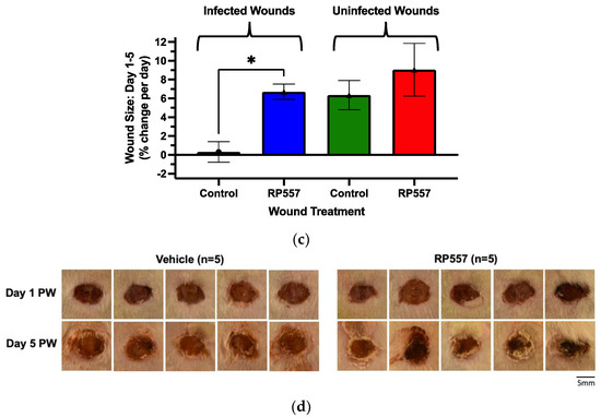 We next compared the effect of RP557 on wound healing in uninfected and infected wounds of TALLYHO diabetic mice. In this study, RP557 had no effect on wound closure in uninfected diabetic wounds (Figure 5a). In contrast, a therapeutic effect of RP557 in defeating an MRSA infection and hastening wound closure was detected within 24 h after application of the first treatment (Figure 5b). Within 48 h after the second dose of RP557, treated wounds were significantly smaller than vehicle-control wounds and continued to rapidly close with daily topical application. A comparison of the effect of RP557 on the rate of wound closure in infected versus uninfected wounds revealed that RP557 markedly increased the rate of closure of infected wounds and returned them to that of uninfected wounds (Figure 5c) within five days. Examination of the quality of wound resolution with RP557 treatment in representative images 24 h after receiving a fourth dose revealed increased desiccation and contraction accounting for its effect on wound closure (Figure 5d).