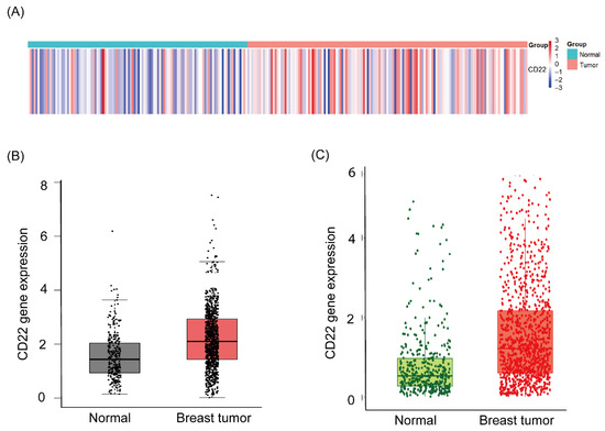 To analyze whether CD22 is highly expressed in breast cancer, differential gene expression analysis was performed. RNA-seq data for 112 normal and 1069 tumor specimens were downloaded from The Cancer Genome Atlas (TCGA) (www.cancer.gov/about-nci/organization/ccg/research/structural-genomics/tcga; accessed on 1 July 2021). Then, we calibrated and standardized the gene counts using the edgeR package (www.bioconductor.org/; accessed on 15 July 2021) version 3.34.0 in R language version 4.0.2 (cran.r-project.org/; accessed on 15 July 2021), and then heat maps of CD22 expression were constructed.