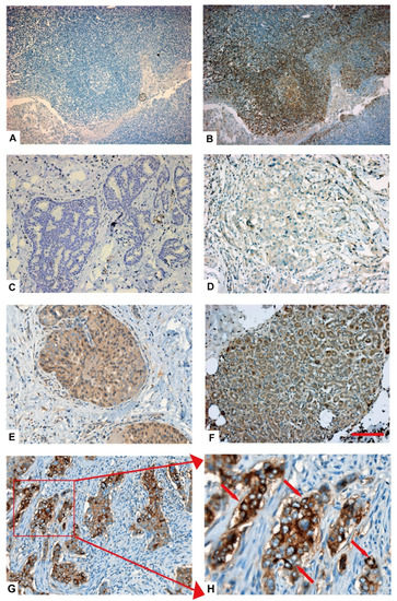 Representative images of immunohistochemical staining of CD22 expression in TNBC specimens. (A) Tonsillar carcinoma incubated with PBS showed no signal; (B) Tonsillar carcinoma incubated with anti-CD22 antibody showed positive expression for CD22; (C) TNBC sample negative for CD22. Relative expression of CD22 in TNBC samples (D) weak-positive, (E) moderate-positive, (F) strong-positive. (G,H) Membrane expression of CD22 in TNBC cells. The red arrows marked membrane expression of CD22 in TNBC cells. Magnifications: 20×, Scale bar 100 µm.