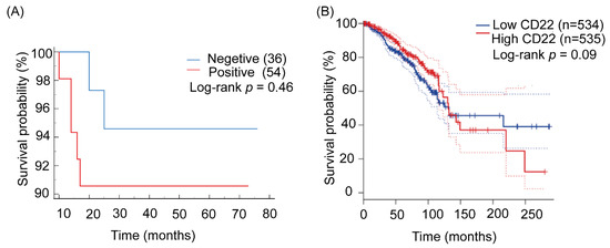 Correlation analysis of overall survival data of TNBC patients and CD22 expression revealed worse overall survival for CD22-positive TNBC patients as compared to CD22-negative patients, but the difference was not statistically significant (p = 0.46) (Figure 4A). The low number of TNBC patients included in the study might be the reason for non-significance. Additionally, the survival plot for CD22 expression and overall survival of breast cancer patients from GEPIA was also not significant (p = 0.09) (Figure 4B).