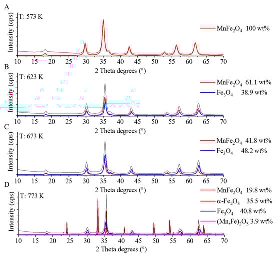 By increasing the temperature to 623 K and 673 K (Figure 1B,C), a new magnetic phase, namely magnetite was also identified next to the spinel structure. The magnetite was formed in a relatively large quantity in the case of these two samples, which were 38.9 wt% and 48.3 wt%, respectively. The characteristic reflections, which belong to Fe3O4, were visible at 18.2° (111), 30.3° (220), 35.7° (311), 43.2° (400), 53.5° (422), 57.1° (511), and 62.3° (440) two theta degrees (PDF 19-629). At a high temperature (773 K), other phases also formed (Figure 1D), and these were the hematite and bixbyite. The latter is a manganese iron oxide (Mn,Fe)2O3 whose appearance is known to be temperature dependent []. The bixbyite content of the sample (773 K) was low (3.9 wt%), its reflection peaks were found at 23.3° (211), 33.0° (222), 35.8° (321), 38.4° (400), 45.3° (332), 49.5° (431), 55.2° (440), 60.5° (611), 63.9° (541), and 65.9° (622) two theta degrees (PDF 89-4836). The reflections at 24.1° (012), 33.7° (104), 35.5° (110), 40.8° (113), 49.9° (024), 54.3° (116), 62.3° (214), and 64.2° (300) correspond to the Fe2O3 phase (PDF 33-0664).