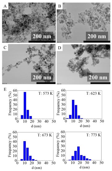 TEM images of the nanoparticles synthesized at 573 K (A), 623 K (B), 673 K (C), and 773 K (D), and their size distribution analysis on histograms (E).
