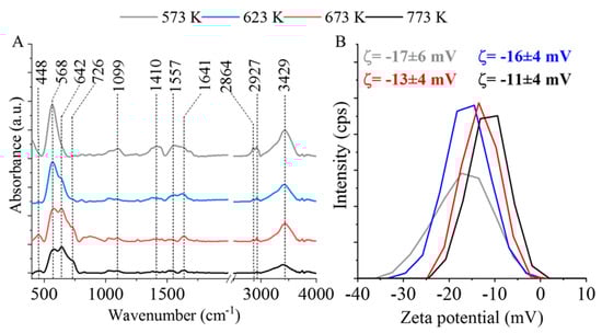 As seen on the FTIR spectrum of the sample produced at 573 K, two characteristic peaks were shown, which are the absorption bands of the Mn–O and Fe–O bonds appearing at 448 cm−1 and 568 cm−1, respectively. These bands correspond to intrinsic stretching vibrations of the metal–oxygen bonds at the octahedral (448 cm−1) and tetrahedral (568 cm−1) sites for spinel MnFe2O4 []. The band at 1099 cm−1 originates from the stretching vibration of the C-O bond []. Other carbon-containing bonds were also identified, such as the FTIR band at 1557 cm−1 of the C=C bonds, whereas the two bands at 2864 cm−1 and 2927 cm−1 wavenumbers correspond to the symmetric and asymmetric stretching vibration of the aliphatic and aromatic C-H bonds, respectively []. Since polyethylene glycol (PEG) served as the reaction medium during MNP production, its imperfect burning could be the reason why traces of carbon were observed in the MNP samples. By increasing the heating temperature, the intensity of the νC-O, νC=C, and νC-H bands decreased. This reduction of the carbon content is a consequence of thermal oxidization and evaporation []. The band at 1410 cm−1 can be assigned to the bending vibration of the hydroxyl groups, while the stretching mode of OH located at 3429 cm−1 is associated with a wide band [,]. The -OH bands at 1410 cm−1 origin from the PEG, but this is found only in the samples which are made at lower synthesis temperatures. In the case of the samples synthesized at higher temperatures (673 K and 773 K), the abovementioned bands are not visible due the decomposition of the polyol. Bands were observed at 1641 cm−1 in all four samples (Figure 3A), which were assigned to the bending vibrations of the adsorbed water molecules [,] and the surface hydroxyl groups on the ferrite []. After the heat treatment, vaporized water molecules adsorb onto the surface of the manganese ferrite samples as they cool to room temperature. An interesting phenomenon was noted on the spectra of the samples produced at 673 K and 773 K. On the band of the metal-oxygen vibrations (568 cm−1), a shoulder was observed at 642 cm−1, which is attributed to the formation of magnetite in addition to manganese ferrite. A further increase in temperature caused the appearance of a second shoulder at 726 cm−1, which can be attributed to the appearance of hematite and bixbyite oxides.