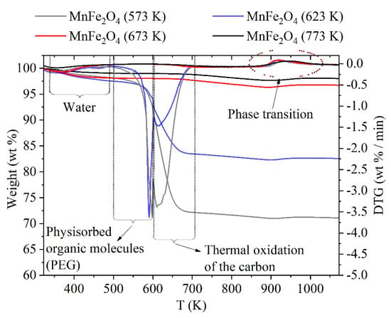 Beside the water loss, there was a significant second weight loss in the case of the MnFe2O4 (573 K) and MnFe2O4 (623 K) samples between 500 and 600 K. This can be assigned to the decomposition of the physisorbed organic molecules which remained from ferrite synthesis, probably polyethylene glycol as was also suggested by Mukhopadhyay []. This finding is also in line with the TGA measurement of pure PEG reported by Massoumi et al., since PEG decomposition occurred as one step around 543–643 K []. Due to this decomposition, an endothermic peak appeared in the TDA curve (Supplementary Materials Figure S4) [] and 3.3–6.9 wt% of the samples was lost in this way. At a higher temperature (between 600 and 705 K), the oxidation of the remaining organic compounds (including the remaining PEG) occurred. This process is responsible for roughly 10 and 20 wt% of the weight loss. These organic compounds remained from the incomplete burning of the PEG during the preparation of the nanoparticle [] due to the lower preparation temperature. The burning of the remaining organic compound (PEG) and carbon led to the appearance of an exothermic peak on the DTA curve (Supplementary Materials Figure S4). Finally, small weight change occurs between 860 and 1016 K for each sample, ascribed to the phase transition (formation of oxides) from the ferrite [,,].