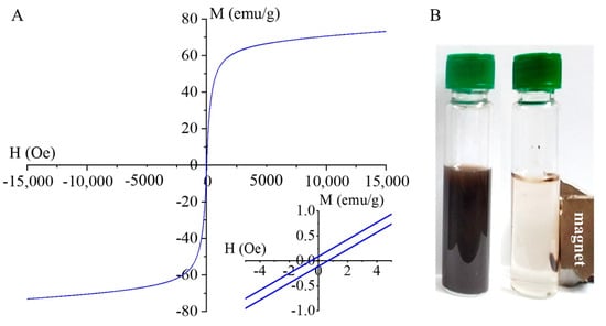 The magnetization curve of the MnFe2O4 MNPs (573 K) was measured at 303 K for a magnetic field of 15,000 Oe using a vibrating sample magnetometer (VSM). The magnetic saturation (Ms) reached 72 emu/g as shown in Figure 5A. A similar Ms value (73 emu/g) was measured by Pradhan et al. in the case of annealed MnFe2O4 particles (created by co-precipitation) [], and comparable Ms values (69.5 emu/g and 74 emu/g) have been reported in other literature as well [,].