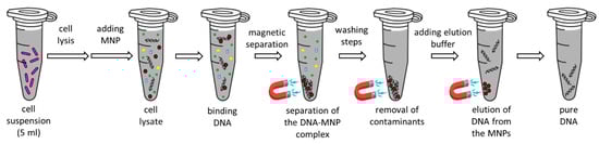 - Berensmeier, S. Magnetic particles for the separation and purification of nucleic acids. Appl. Microbiol. Biotechnol. 2006, 73, 495–504. [Google Scholar] [CrossRef]