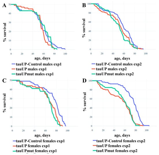 To evaluate the effect of the increased expression of the D. melanogaster tau gene on lifespan, we used the transgenic lines with cDNA insertions encoding the normal RA transcript of the fruit fly tau gene (the tauUP line) or the RA transcript with mutations leading to amino acid substitutions in phosphorylation sites serine 103, threonine 151, and serine 343, which are targets of GSK3 protein kinase (the tauUPmut line). The tauUP-Control line with the same genetic background was used as a control. Transgene activation was induced in the nervous system at all stages of development using the pan-neuronal driver line NS. Trait evaluation was performed in two experiments, with sample sizes of 50 (Figure 1A,C) and 100 (Figure 1B,D) individuals per genotype/sex, respectively. In the first experiment, the overexpression of both tau transgenes resulted in a significant decrease in the mean lifespan of females (p = 0.006, Figure 1C) but not of males (p = 0.388, Figure 1A). In the second experiment with a larger sample, the negative effect was stronger in females (p < 0.001, Figure 1C) and a weak but statistically significant negative effect was detected in males (p = 0.016, Figure 1B). Such fluctuations between the results of repeated experiments are quite typical when the effects are virtually absent: in several subsequent experiments, the differences turned out to be significant or not at random []. In none of the experiments did the lifespan of individuals with the overexpression of the normal and mutant tau transgene differ significantly from each other.
