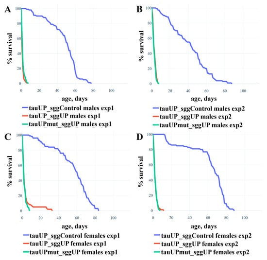 In [], using the sggUP and sggUP-Control lines and the pan-neuronal driver elav, we demonstrated that the overexpression of the RB transcript of the shaggy gene encoding the GSK3 protein kinase of D. melanogaster in the nervous system severely reduces the lifespan of males and females (mean lifespan of males is ~2 days, females ~6 days). Since the tau protein is a target of GSK3, we can assume that a simultaneous increase in tau and shaggy expression will result in a non-additive enhancement of the effect in females, i.e., lethality. However, if the sites at which GSK3 phosphorylates tau are altered, the interaction of the proteins will be disrupted and there will be no enhancement of the effect. To test these assumptions, we used individuals whose genome contained two transgenes: one providing the increased expression of the normal or mutant RA transcript of the tau gene and the other providing the increased expression of the RB transcript of the shaggy gene (the lines tauUP_sggUP and tauUPmut_sggUP). The tauUP_sggUP-Control line with the same genetic background was used as a control. The transgene activation was induced in the nervous system at all the stages of development using the pan-neuronal driver line NS. In two repeated experiments, males and females with two activated transgenes were viable, and although their lifespan was greatly reduced compared to controls, it did not differ from the lifespan of males and females with an overexpression of the shaggy gene alone [] (Figure 2; the mean lifespan of males was ~2 days, of females ~3 days). Differences in lifespan between males (or females) with an increased expression of the normal tau gene and shaggy gene and males (or females) with an increased expression of the mutant tau gene and shaggy gene were not found.
