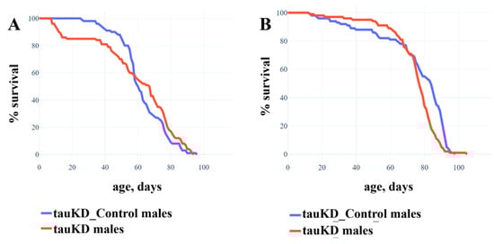 Decreased expression of the tau gene has no effect on the lifespan of males and females. (A)—Experiment with males. (B)—Experiment with females. A detailed description of the genotypes is given in the Materials and Methods section. Statistical analysis of the data is given in the Supplementary Materials Table S3.