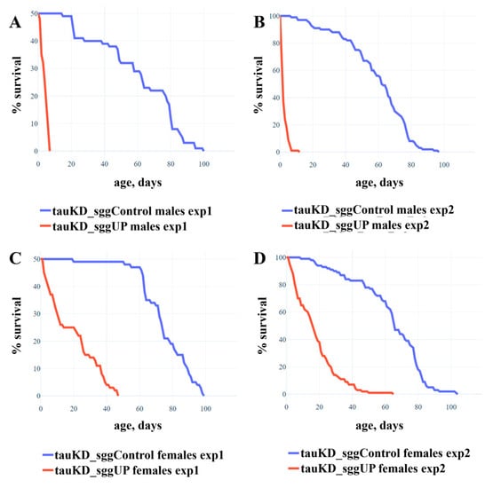 Among the considerable number of proteins associated with the occurrence of diseases of the nervous system, the tau protein plays an important role []. Note, however, that studies on this protein have yielded many contradictory results. There is evidence that the level of tau activity can both promote and be a marker of nervous system diseases and play a protective role [,,]. The revealed contradictions could be due to the fact that, in a number of cases, tau properties were studied without taking into account specific protein isoforms, the genetic environment, and the sex of individuals. As for the effect of tau on lifespan, it has not been sufficiently characterized [].