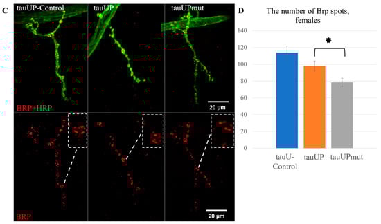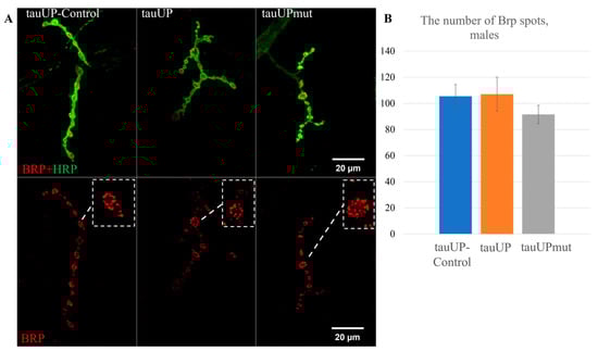 To test the hypothesis that a sex-dependent change in lifespan induced by increased tau expression may correlate with changes in synaptic activity, we estimated the number of Brp spots in synaptic contacts in the neuromuscular junctions of males and females with the overexpression of the normal RA transcript of the tau gene and with the overexpression of the RA transcript of the tau gene mutant for GSK3 phosphorylation sites using the tauUP, tauUPmut, and tauUP-Control lines with the same genetic background. Transgene activation was induced in the nervous system at all stages of development using the pan-neuronal driver line NS. The number of active zones of synaptic contacts characterized by the number of spots of Bruchpilot (BRP), a protein specific to active synaptic zones, is often used to indirectly evaluate synaptic activity [,].