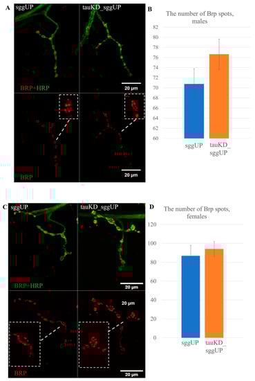 Activation of the transgene that decreases the expression of the tau gene does not affect the number of Brp spots in synaptic contacts reduced by the activation of the transgene that increases the expression of the RB transcript of the shaggy gene. (A,B)—Immunostaining and the mean number of Brp spots in males. (C,D)—Immunostaining and the mean number of Brp spots in females. A detailed description of the genotypes is given in the Materials and Methods section.