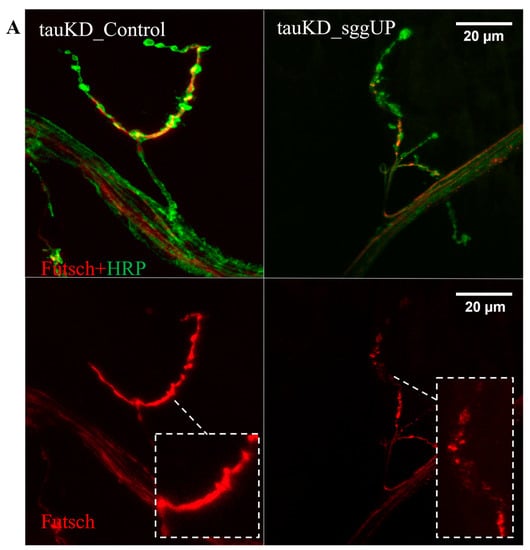It remains unclear which molecular mechanism may be responsible for the effect of tau expression on the distribution of Futsch. It can be assumed that the phosphorylation level and stability of the Futsch protein, a direct target of the GSK3 protein kinase, may vary, depending on the total expression of the proteins of the MAP family. However, in this case, an increase rather than a decrease in the amount of tau against the background of GSK3 excess would lead to a compensatory effect, which we did not observe in our experiments. In [], it was demonstrated that the tau deletion does not trigger compensatory mechanisms affecting the mRNA expression of other genes encoding MAPs, including Futsch; however, in that case, GSK3 expression remained normal. So far, data on the effect of reduced tau expression on the Futsch protein are very scarce, and this issue requires further study.