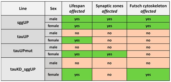 The identification of risk factors for the development of neurodegenerative diseases allows their causes to be figured out and ways to combat them to be found. The analysis of genetic factors allows to understand the molecular basis of hereditary forms of diseases, and the frequency of alleles associated with the manifestation of the pathologies of the nervous system characterizes the premature death factor burden in the human population. The influence of genetic factors strongly depends on gender and age [,,]. Age is most strongly associated with an increased risk of neurodegenerative diseases as well as with impaired proteostasis, mitochondrial dysfunction, and other changes associated with neurodegeneration [,,]. It has been shown that the level of stress induced in the nervous tissue during aging is dependent on sex and the interaction of sex hormones with specific receptors in the nervous system []. Sex differences in the nervous system can be explained by the sex-chromosome dosage effect []. It is known that the risk of certain neurodegenerative diseases is higher in women, and in women with moderate cognitive impairment, the tau protein has a wider connectivity network between different brain regions [,]. In Drosophila, a number of studies have also demonstrated the role of sex, in particular, sex-dependent differences in tau expression levels in controlling the pathologies of the nervous system. For example, it has been shown that male and female transcriptomes differ after traumatic brain injury in Drosophila, associated with a significant risk of developing neurodegenerative pathologies []. Decreased tau expression affected motor function and transcription in a sex-dependent manner, but not all neurological pathologies that appeared after brain injury correlated with tau expression levels [].