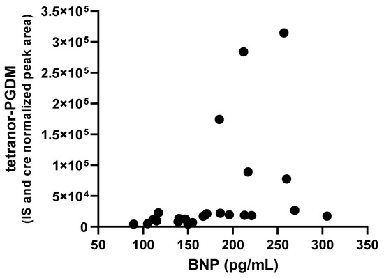 There was a significant correlation between urinary tetranor-PGDM levels and BNP concentration (p = 0.0001, Spearman rank correlation test), indicating that tetranor-PGDM correlates with cardiac function that can be assessed using BNP (Figure 2). This result suggests that tetranor-PGDM may be a useful biomarker for heart failure, similar to conventional BNP levels. It remains unclear whether tetranor-PGDM is more sensitive than BNP as a biomarker for early-stage heart failure in MD patients, because this study was limited to patients whose BNP levels were >100 pg/mL during standard administration. It is necessary to evaluate the correlation between tetranor-PGDM and BNP in earlier patients with various stages of heart failure to assess its potency as a biomarker of cardiac function.