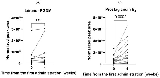 Comparison of normalized peak area of (A) tetranor-PGDM and (B) prostaglandin E3 in 17 DMD patients between pre- and post-administration. p-values were determined using the Wilcoxon signed-rank test. ns, not significant.
