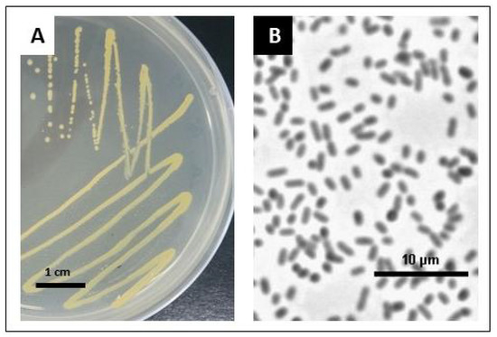 The bacteria isolated from surface-sterilized stevia seeds have rod-shaped cells about 1.5 μm long and yellowish in color (Figure 1). Bacteria were classified as Gram-negative and were further identified via sequence analysis of the PCR product obtained with universal primers for the 16S rRNA coding gene. The basic local alignment search tool for nucleotides (BLASTn) search score analysis suggested that the bacteria strain isolated from stevia seeds belongs to the genus Pantoea. Our strain showed the greatest similarity to the strains of P. agglomerans and P. vagans (Table S1, Figure S1 in Supplementary File S1). We named the isolated strain SRS89.